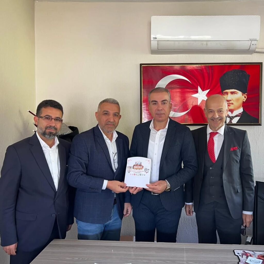 HATAY KONFEDERASYONU ve bünyesindeki federasyonlarla birlikte İstanbul Havaalanı Millet Parkı’nda 29 Ekim 2 Kasım 2025 tarihleri arasında düzenlenecek ‘HATAY GÜNLERİ’ etkinliğinin Hatay’ın en büyük atanmış ve seçilmişlerinin tam desteğini alarak gerçek anlamla bir ‘Hatay Günleri’ etkinliği düzenleyerek etkinliğin başarıya ulaşması için çalışmalarını tam gaz sürdüren Konfederasyon başkan ve yönetim kurulu üyeleri ilk ziyaretlerini Hatay Büyükşehir Belediye Başkanı Mehmet Öntürk’ü ziyaret ederek başlattılar.